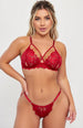 Un conjunto delicado y atrevido confeccionado en exquisito encaje con sensuales transparencias. El brasier de copas triangulares presenta un llamativo diseño cut-out que enmarca el bajo busto y tiras cruzadas en el escote. Se complementa con una tanga a juego de tiro bajo con detalles strappy en la cadera, creando una silueta irresistible.