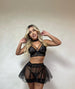 Un conjunto delicado y lúdico, perfecto para una noche especial, que combina encaje floral y sutiles transparencias con tul ligero. Incluye un bralette strappy y una coqueta minifalda de estilo tutu, complementada con un choker y bandas de muslo a juego. Esta pieza crea un look completo que irradia feminidad y una dulzura irresistible.