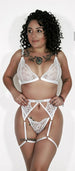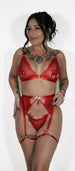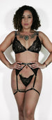 Un conjunto seductor que combina la delicadeza del encaje floral con un estilo atrevido y estructurado. El brasier con aros ofrece soporte y el cinturón liguero de cintura alta incorpora detalles de material brillante y adornos metálicos. Esta pieza irresistible enmarca la figura, brindando sensualidad y un look lleno de poder y sofisticación